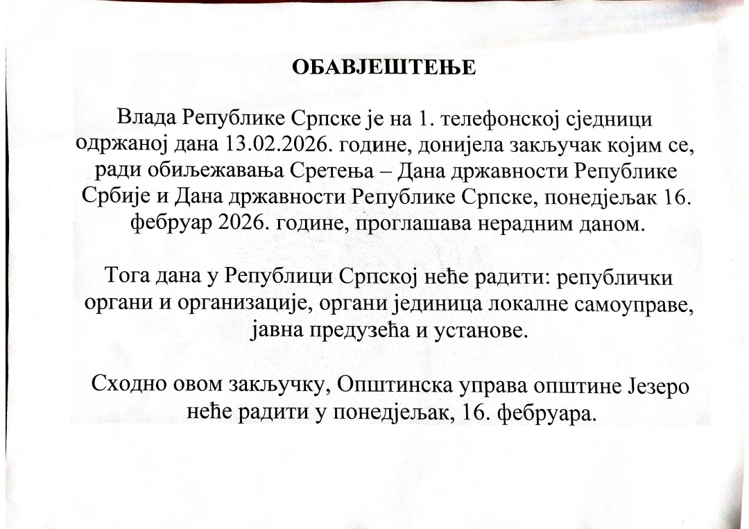 Обавјштење о нерадном дану Општинске управе општине Језеро