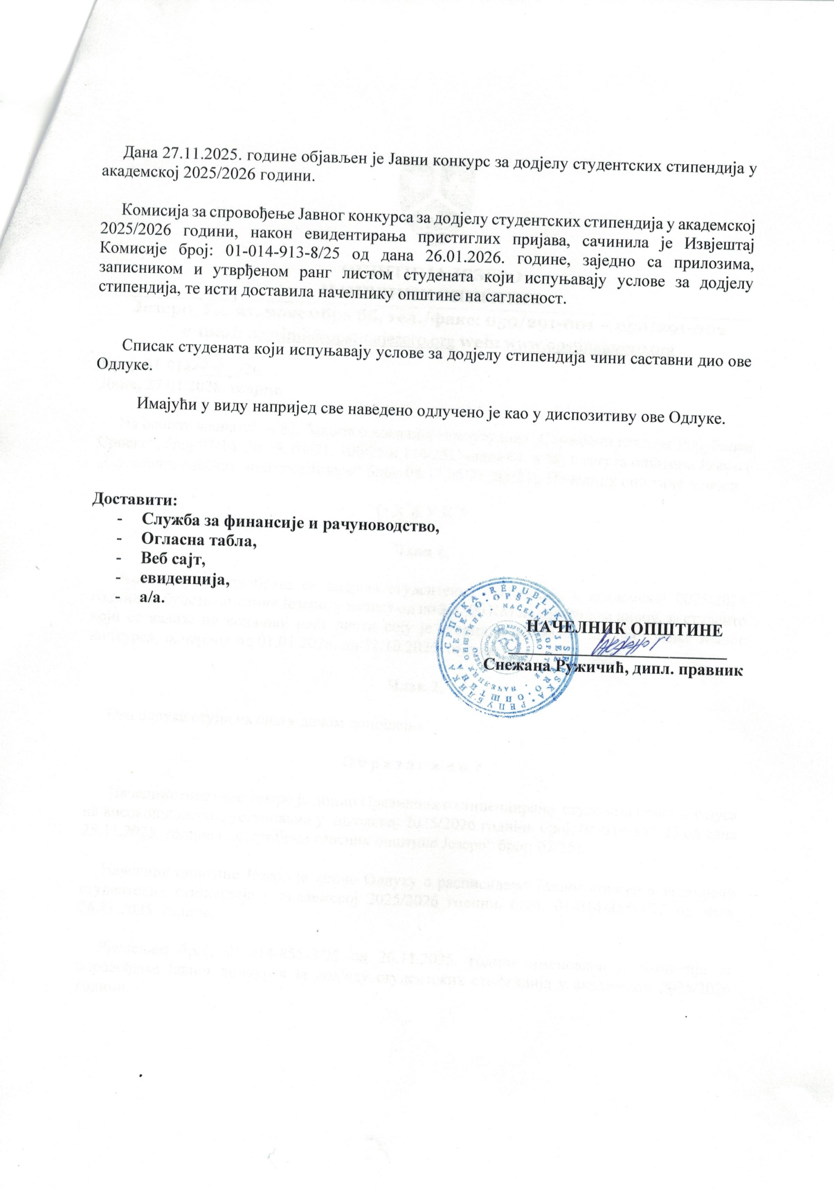 Одлука о додјели студентских стипендија за академску 2025/2026